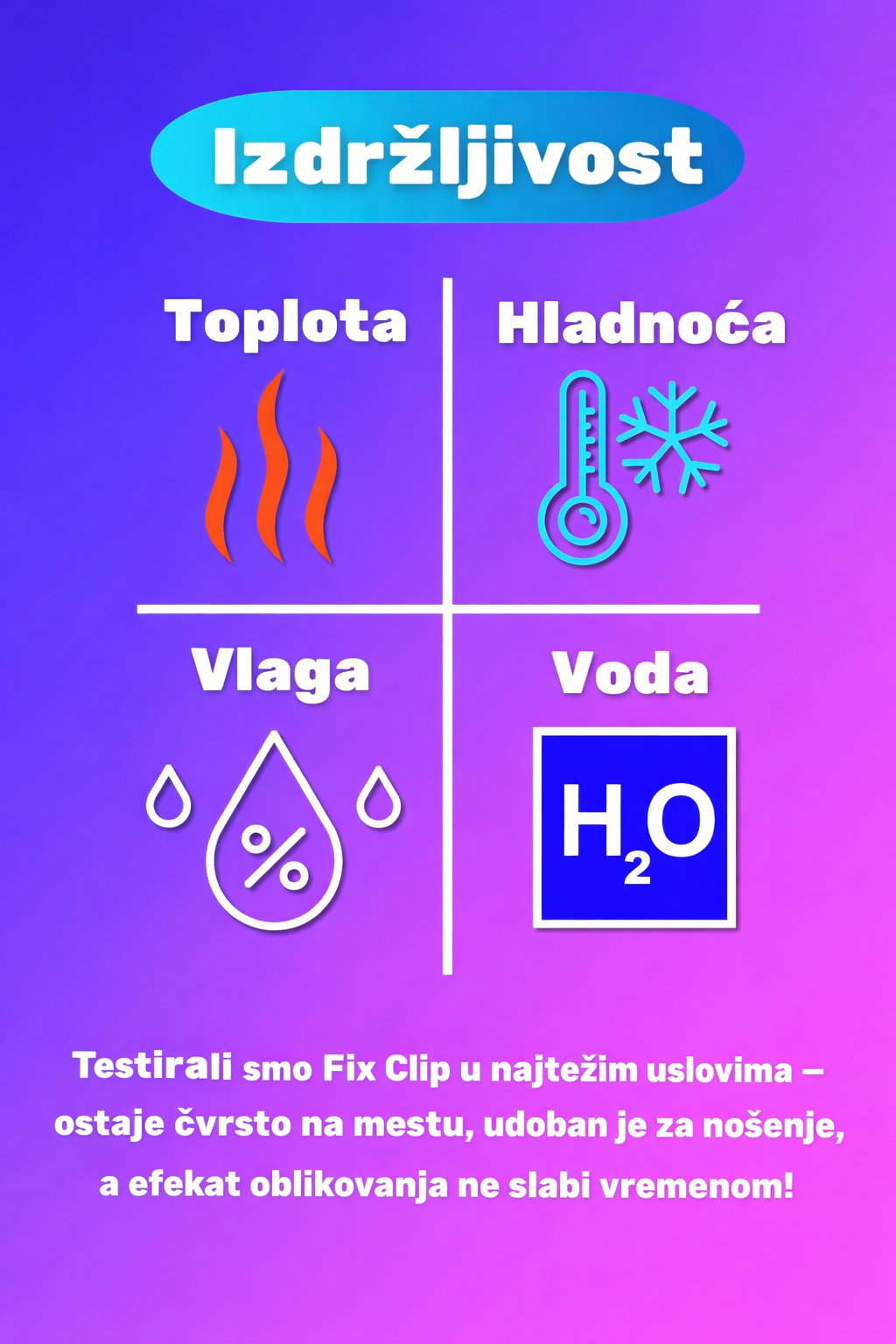 Bilo da je vrućina, hladnoća ili vlaga — Fix Clip ostaje na mestu i pruža stabilan efekat tokom celog dana. Pouzdan kad ti je najpotrebnije.